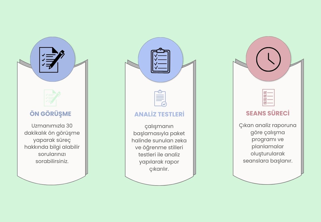 Hem öğrenciler hem de veliler için zamanın en verimli şekilde kullanılmasını hedeflediğimiz danışmanlık süreci üç aşamadan oluşuyor; Ön Görüşme, Analiz Testleri, Seans Süreci…